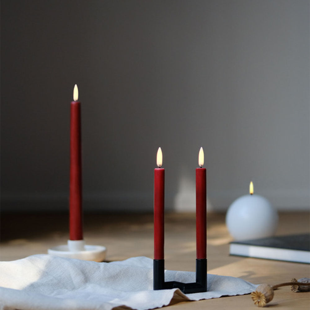 The Carmine Red Classic Taper LED Candles by Uyuni bring timeless elegance and modern innovation to your holiday home decor.