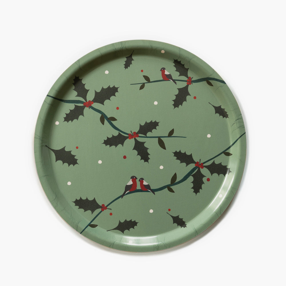 The light green serving tray features branches with green winter leaves and birds surronded by white snowflakes.