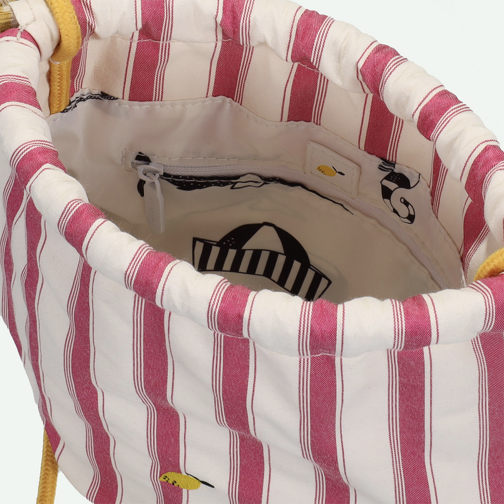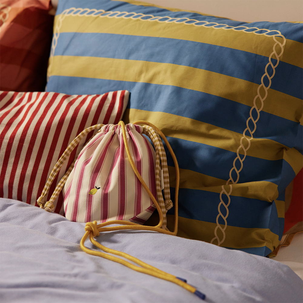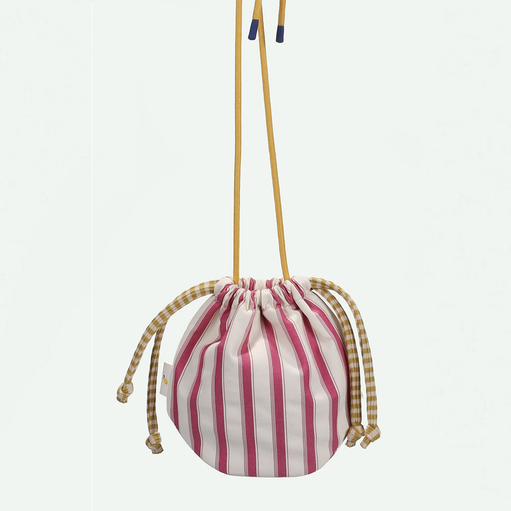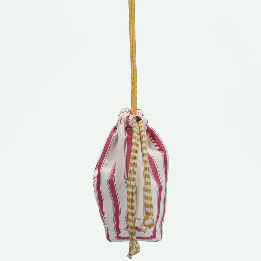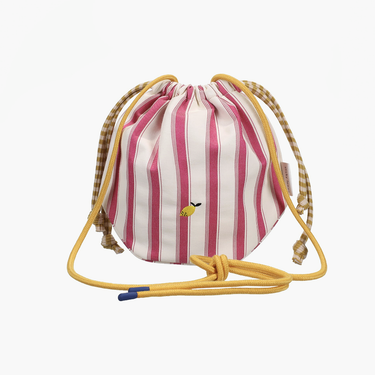 Made from a soft pyjama-striped cotton blend fabric, it features a striped yellow drawstring and a yellow shoulder strap that you can tie to your perfect length.