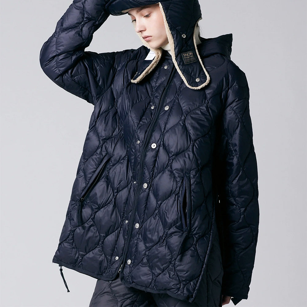 Experience luxurious warmth and a modern oversized silhouette with Taion's Military Hooded Zip Down Jacket. You can create a slimmer silhouette by using the buttons on both sides of the front placket.