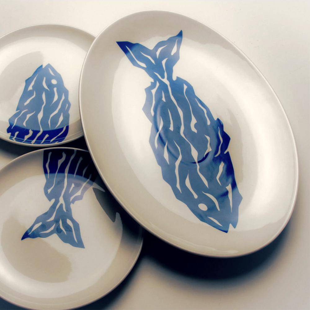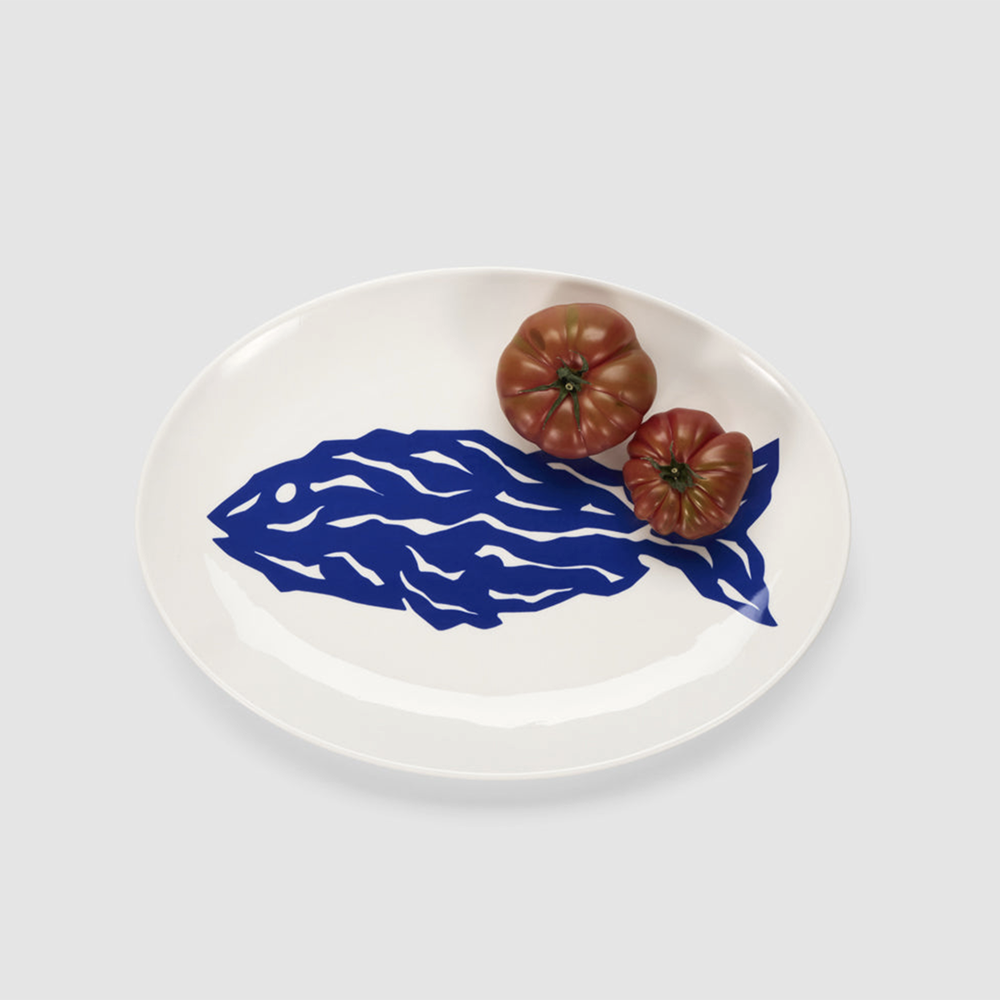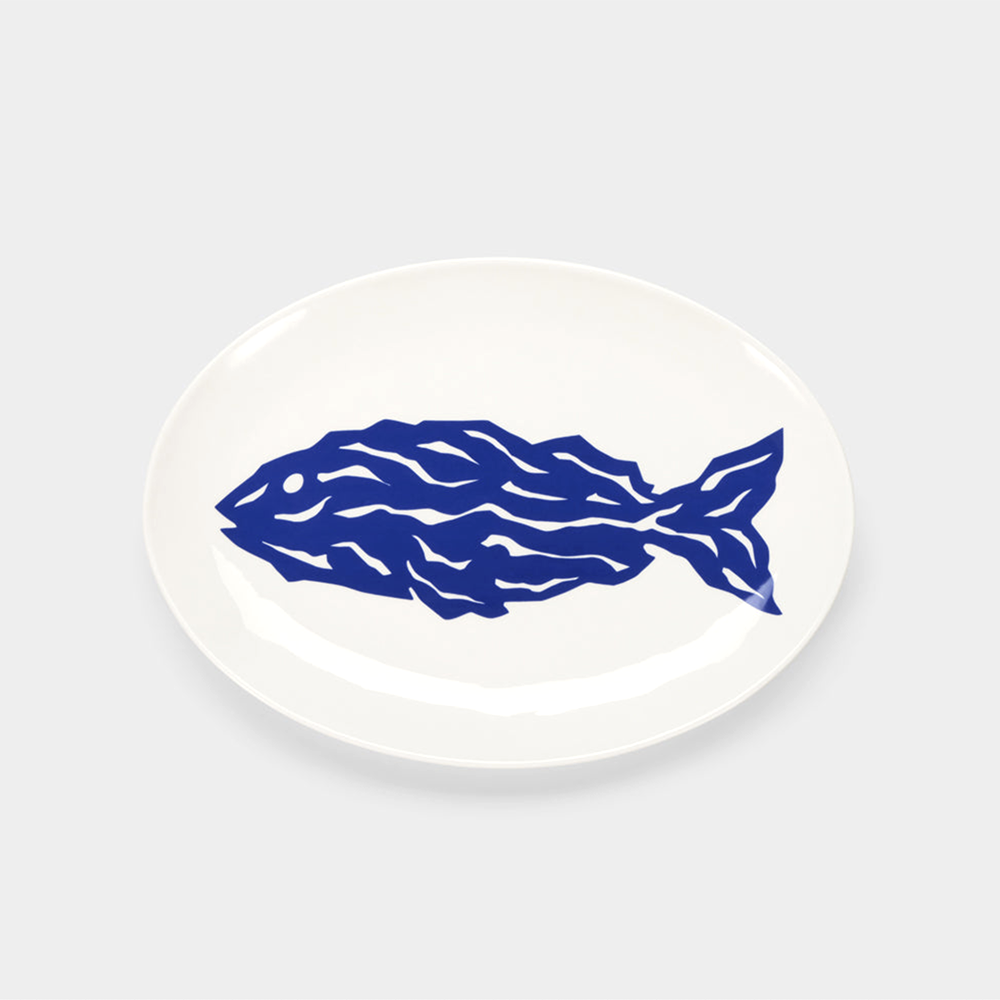 Crafted from luminous white porcelain, this generous platter features a striking blue groper fish illustration inspired by French artist Jean Lurçat, perfect for presenting seafood or any Mediterranean dish.