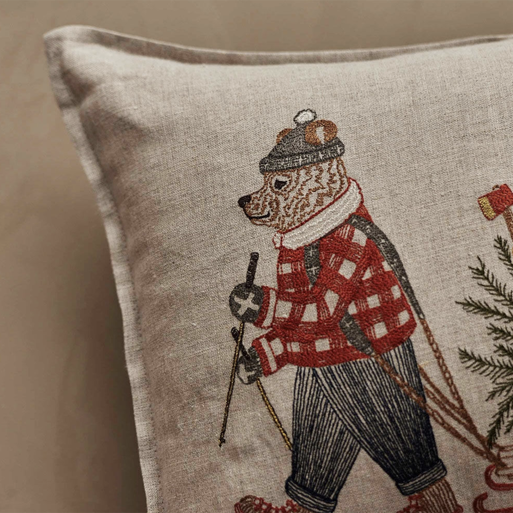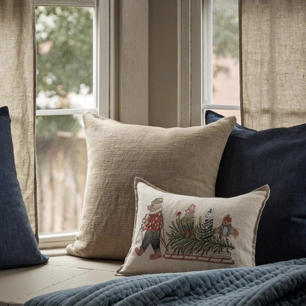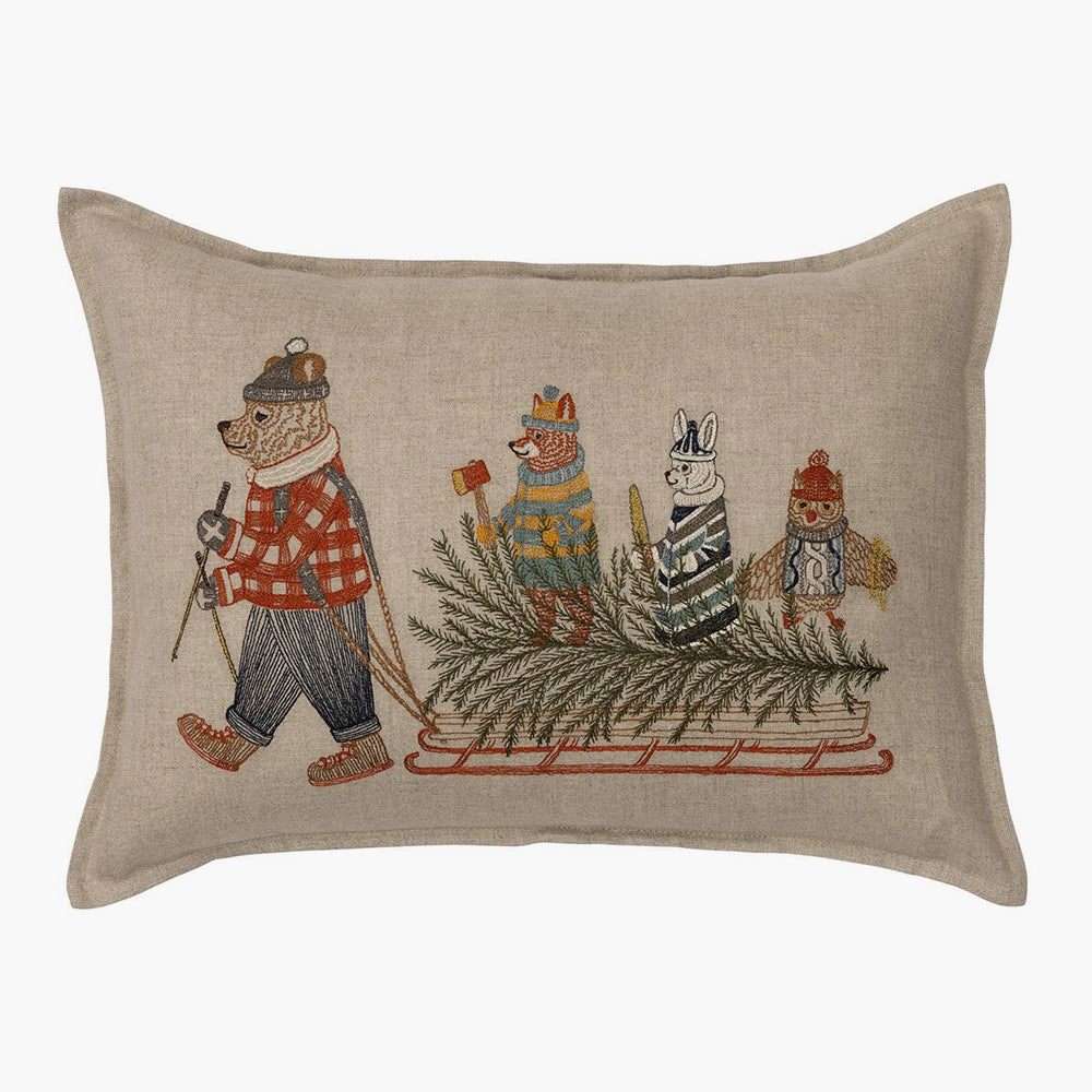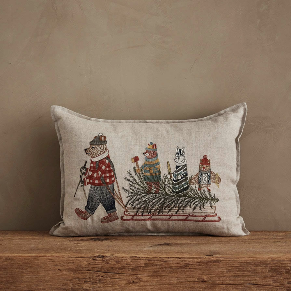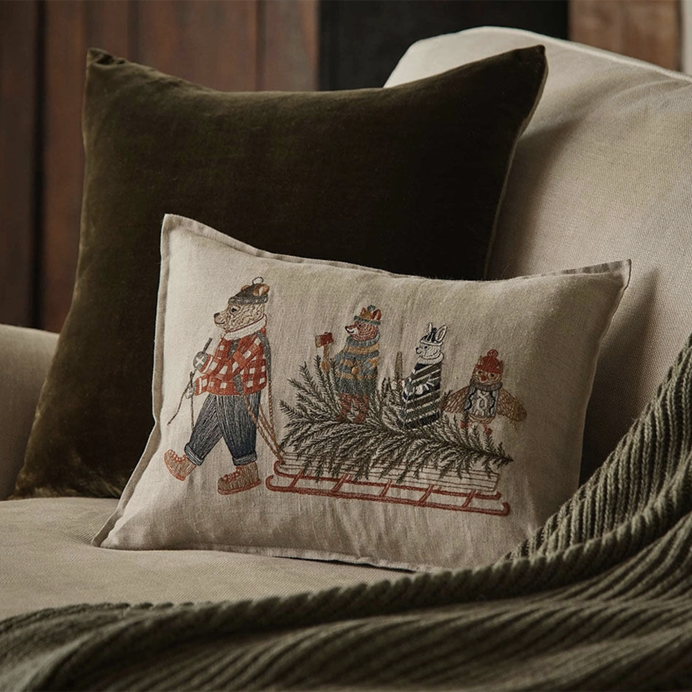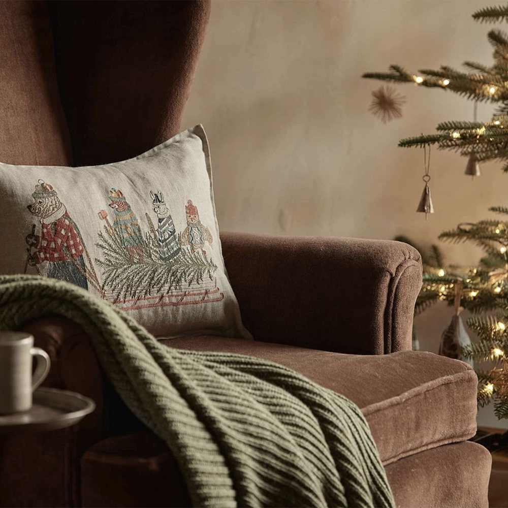 This linen cushion beautifully captures the cherished tradition of finding the perfect Christmas tree.