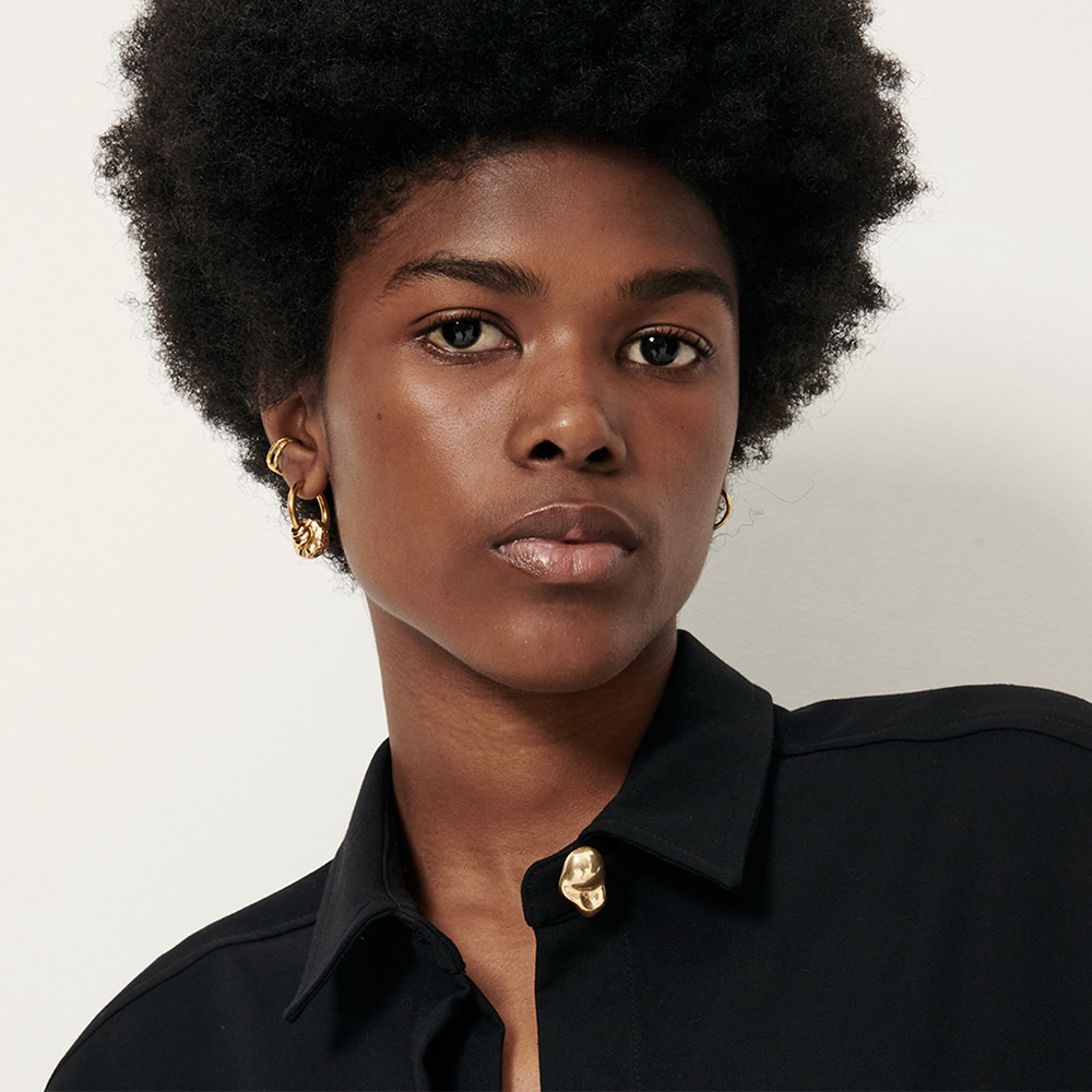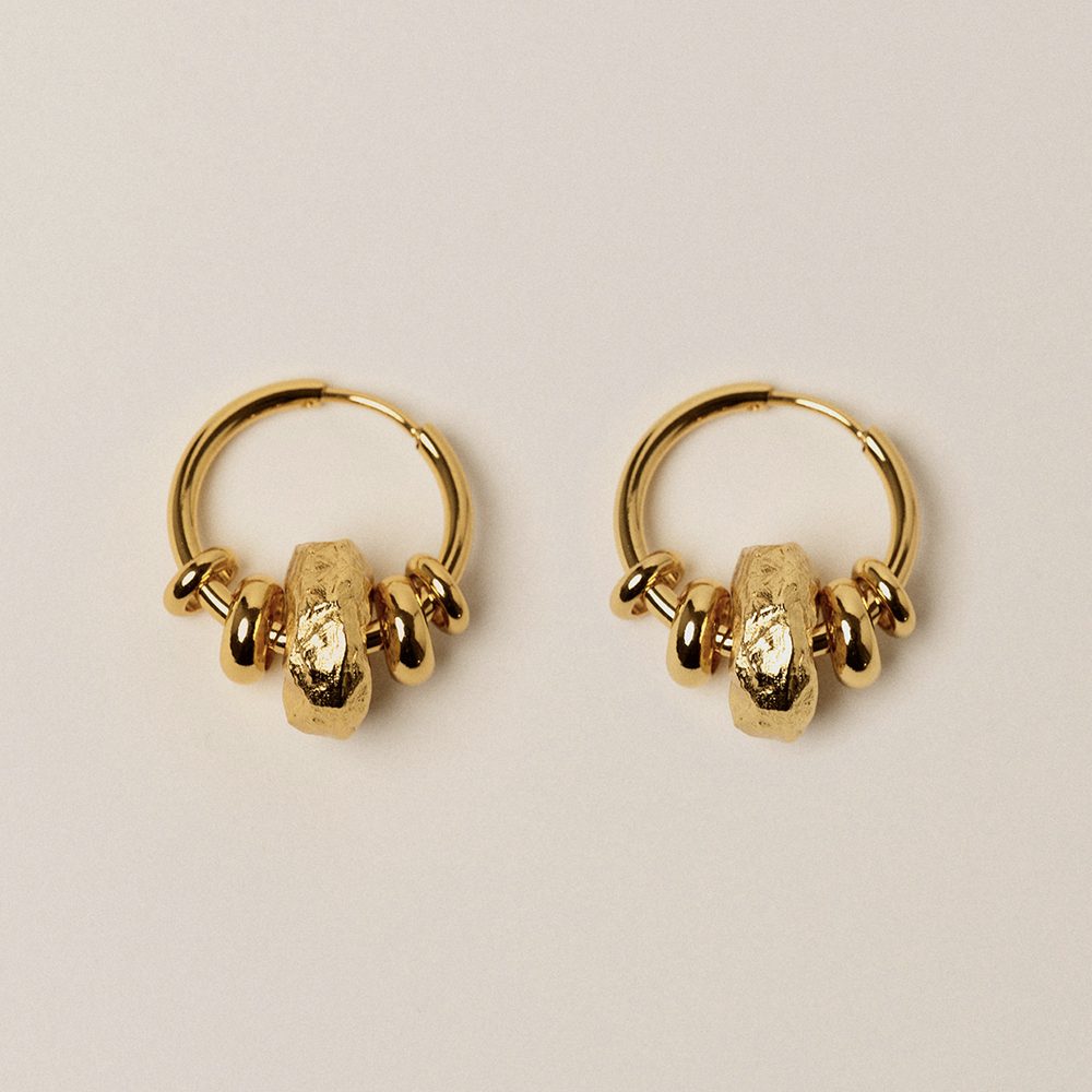 The Leelo Gold Hoop Earrings from Sessùn feature a delicate hoop strung with textured gold rings in varying sizes to create a sophisticated, multidimensional look.