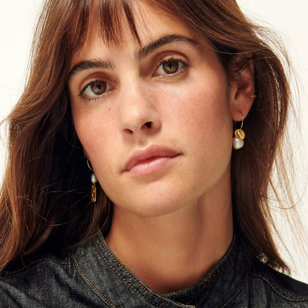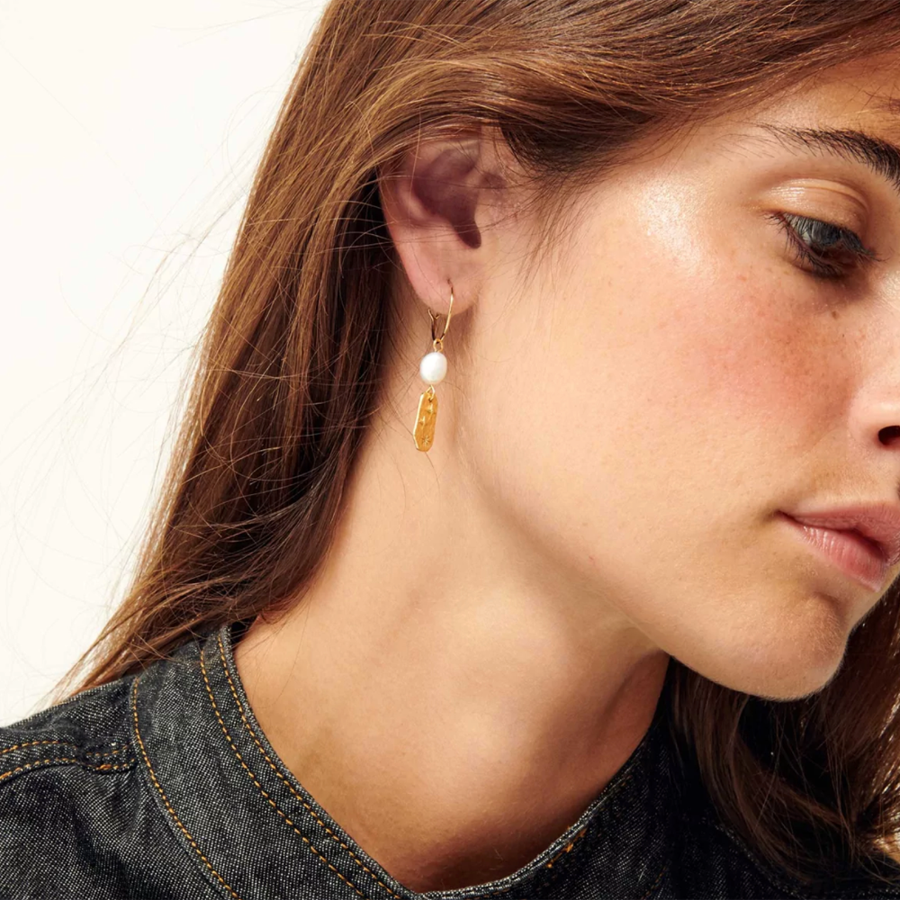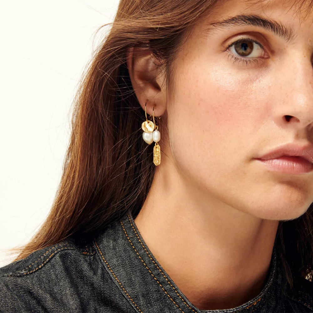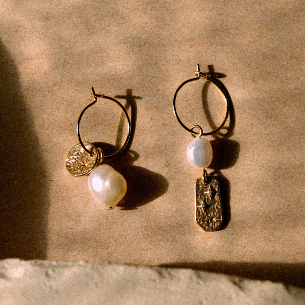 The Soren Mismatched Pearl Gold Hoop Earrings from Sessùn feature freshwater pearls and small gold pendants strung on a delicate gold hoop.