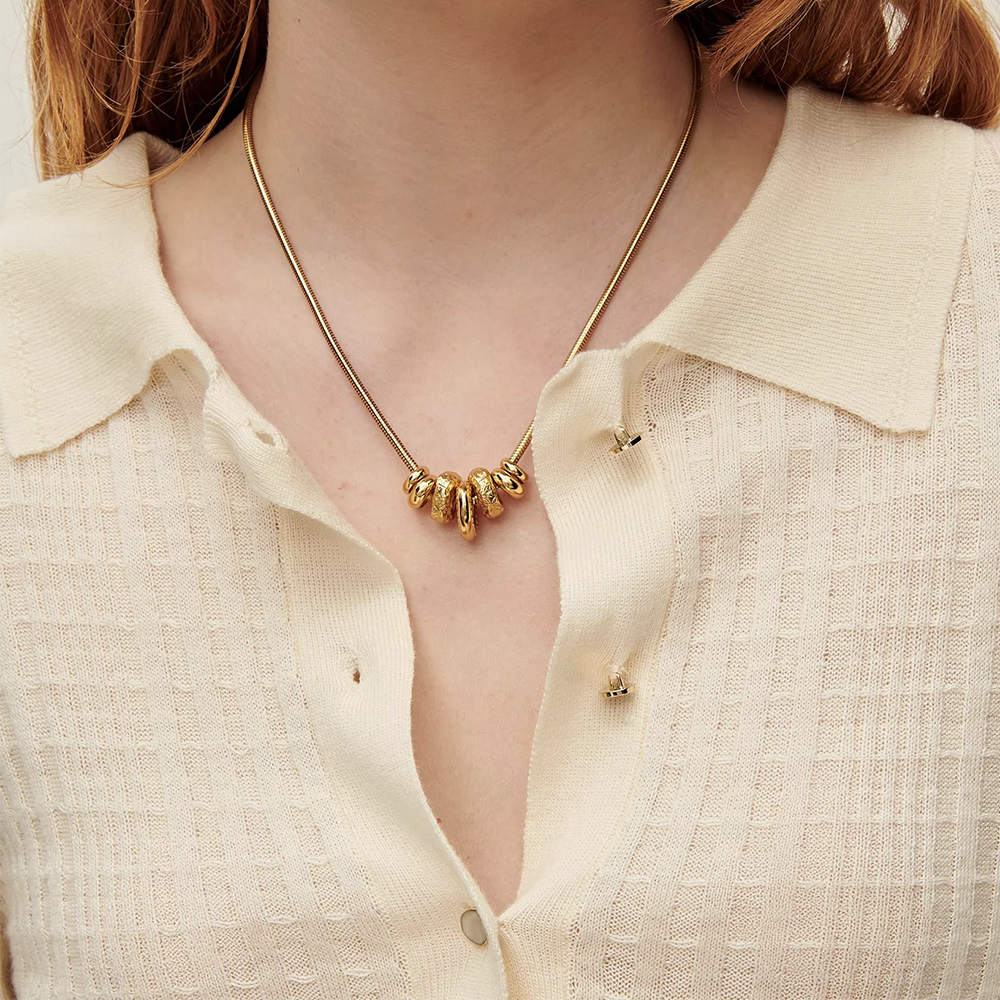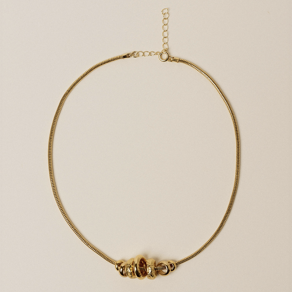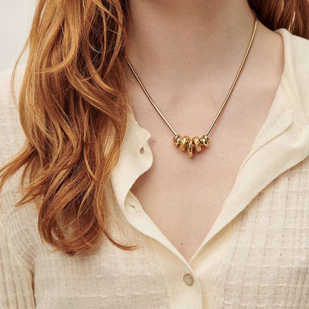 The Yaya Gold Necklace from Sessùn features a smooth snake chain strung with textured gold rings in varying sizes to create a sophisticated, multidimensional look.