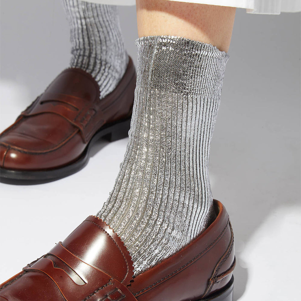 Crafted from the finest silk yarn, these socks are soft, stretchy, and highly durable. The metallic finish adds a hint of glamour that gradually fades with washing, revealing the natural brilliance of the silk underneath.