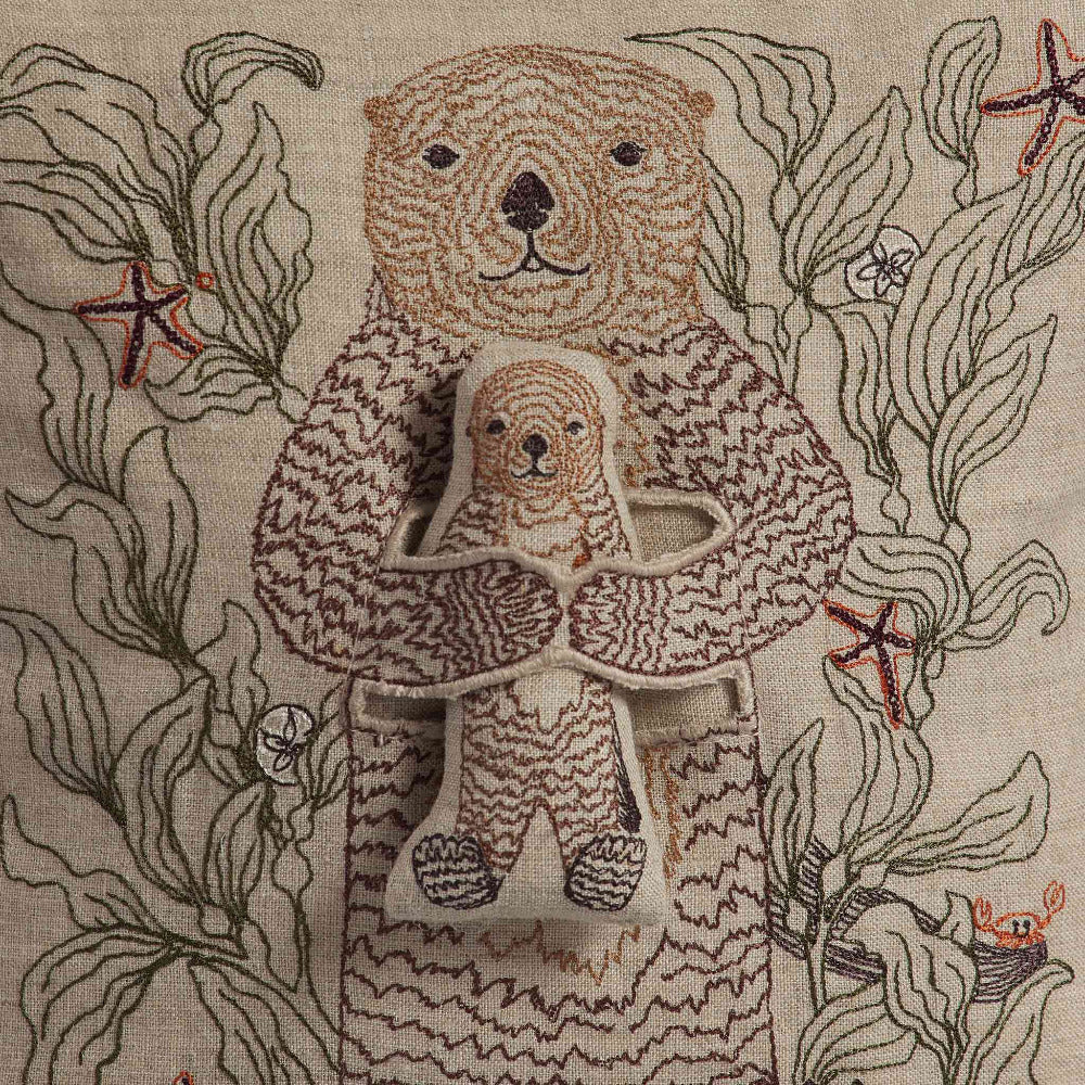 The embroidered linen cushion features an adorable sea otter mama hugging her baby otter. The mini-pillow baby otter can be removed from the pocket.