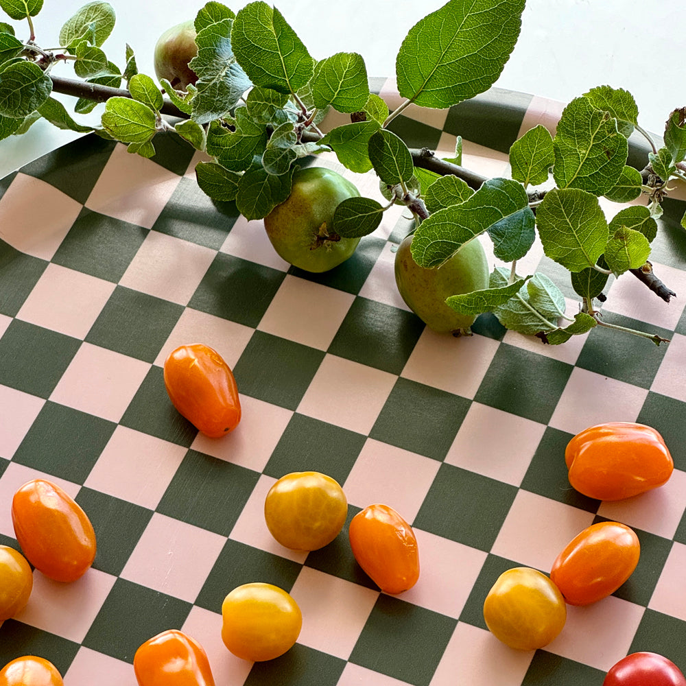 Elevate your table setting with this classic serving tray in an oilve green and almond beige checker pattern.