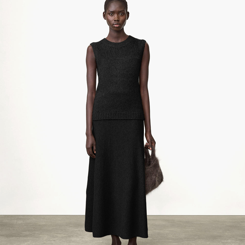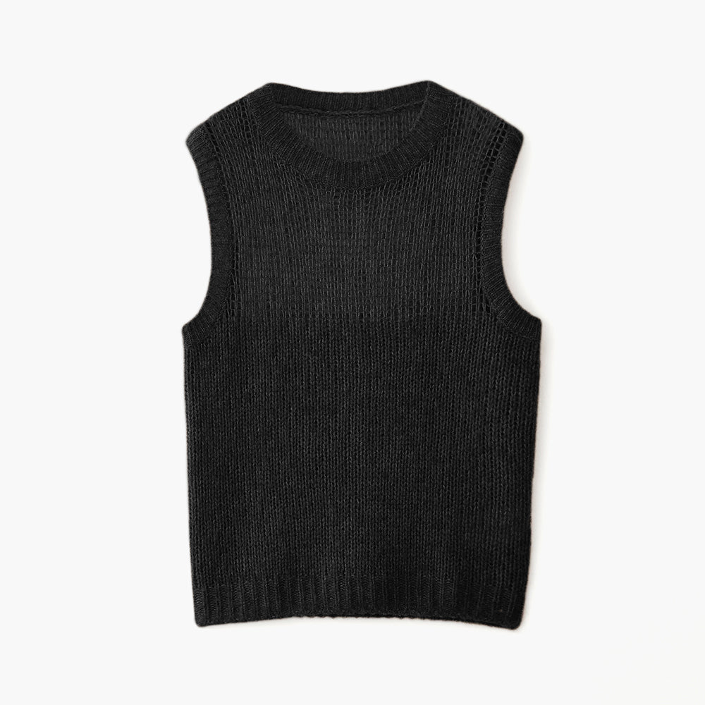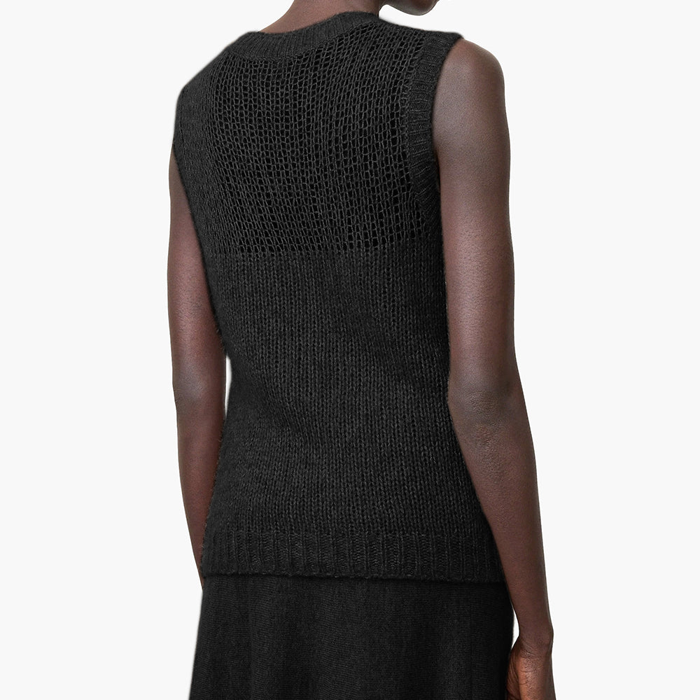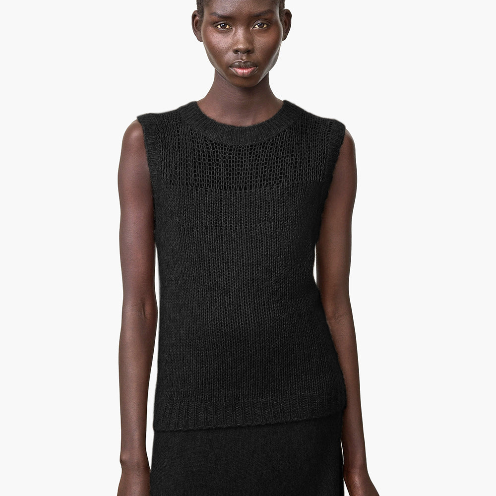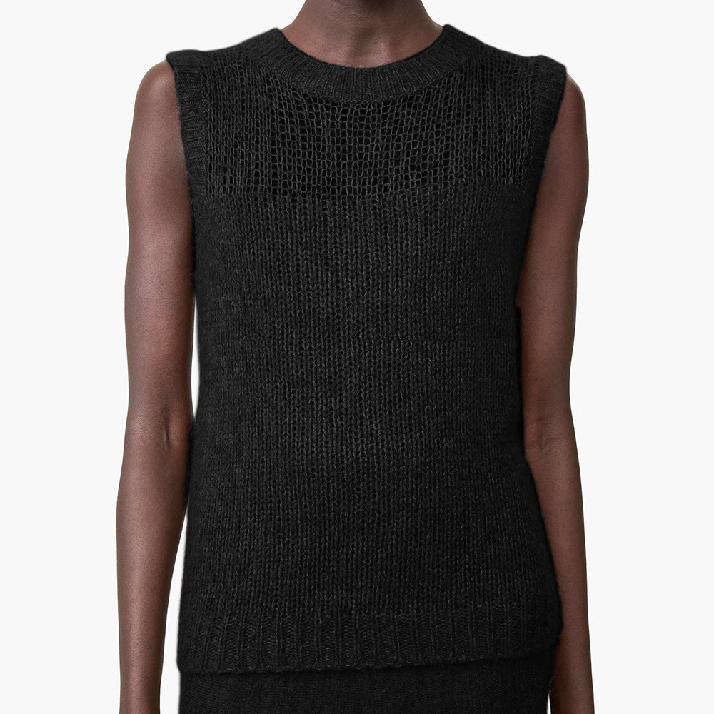 The regular fit, sleeveless silhouette is defined by sheer and opaque panels knitted in two different gauges which frame the shoulders and unveil a subtle hint of skin.