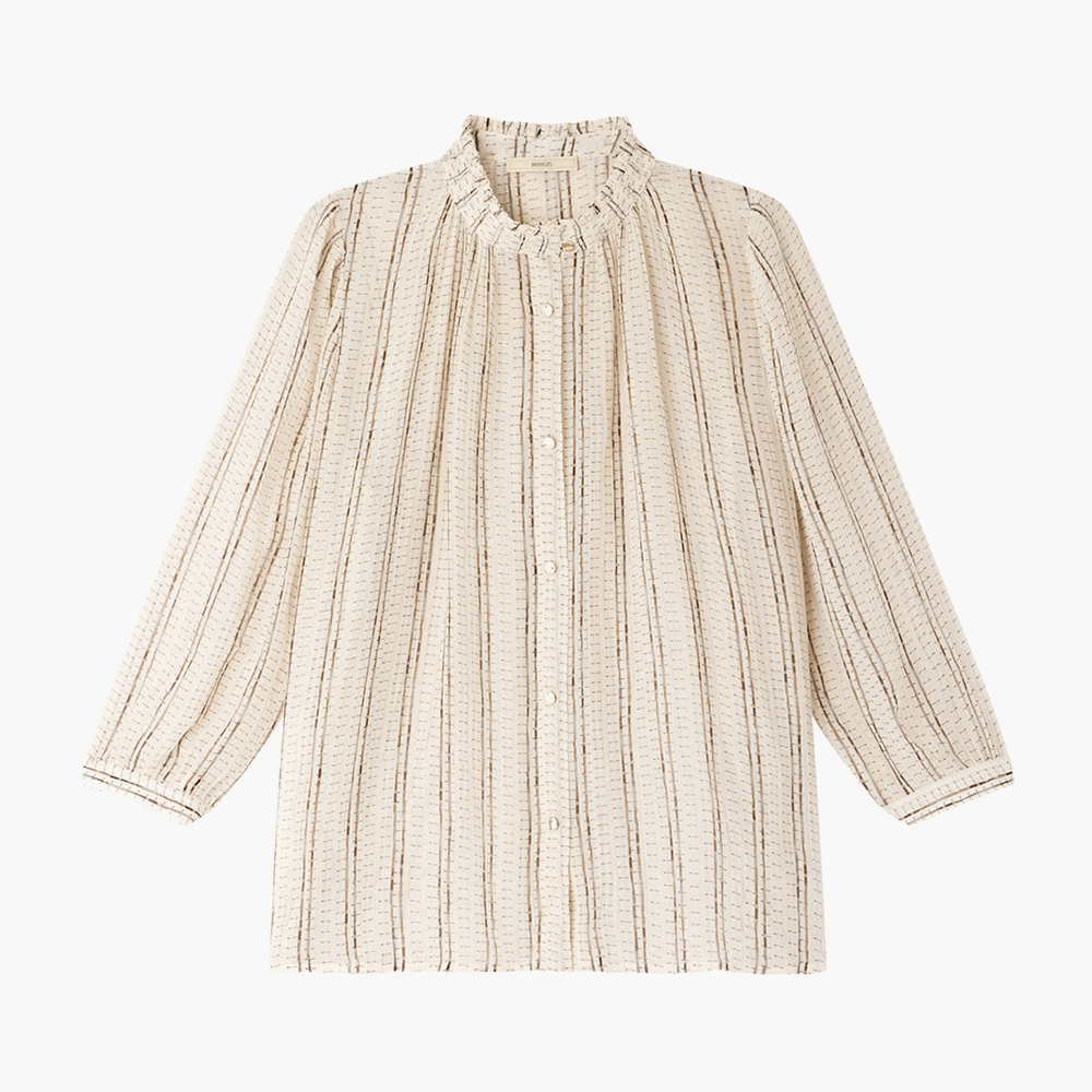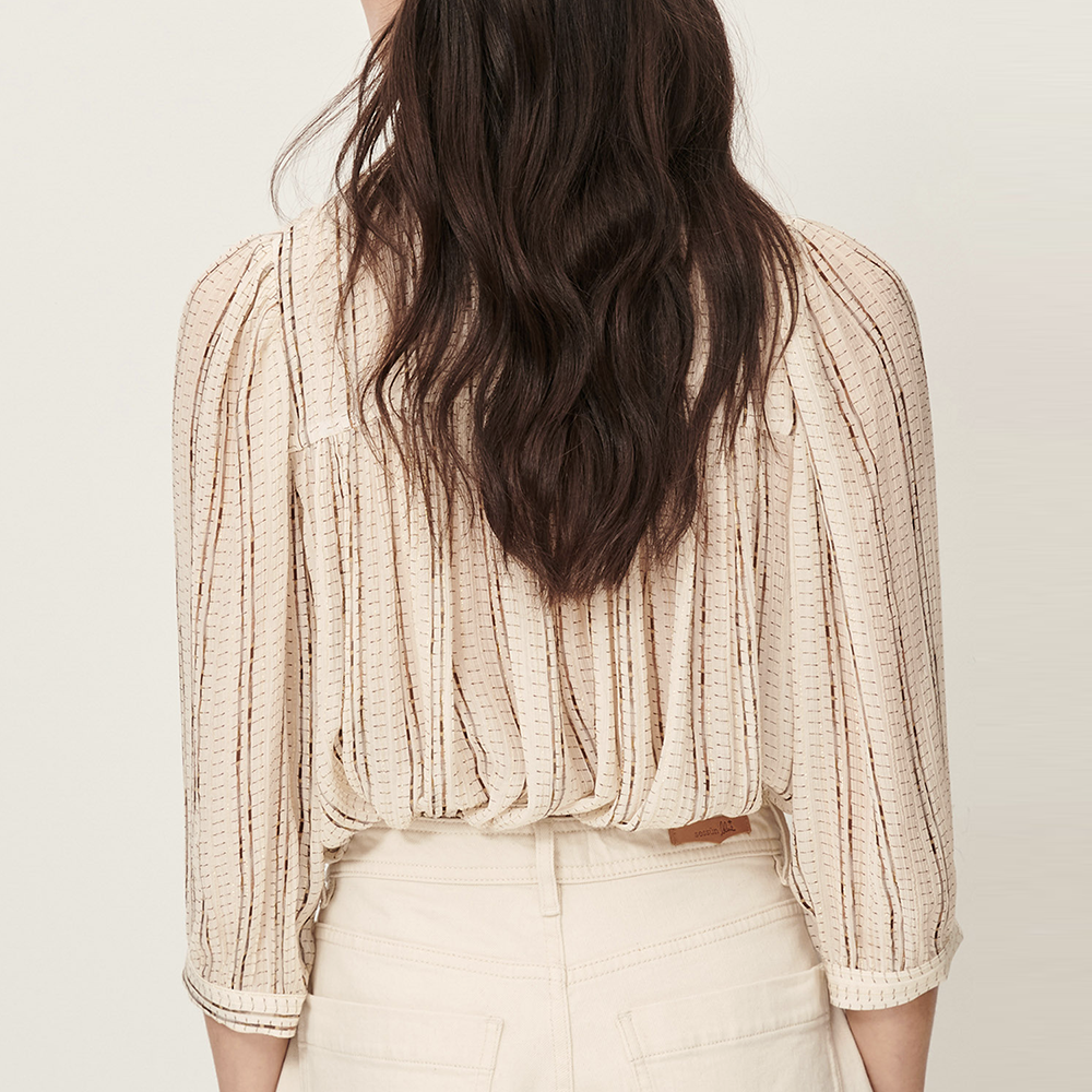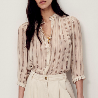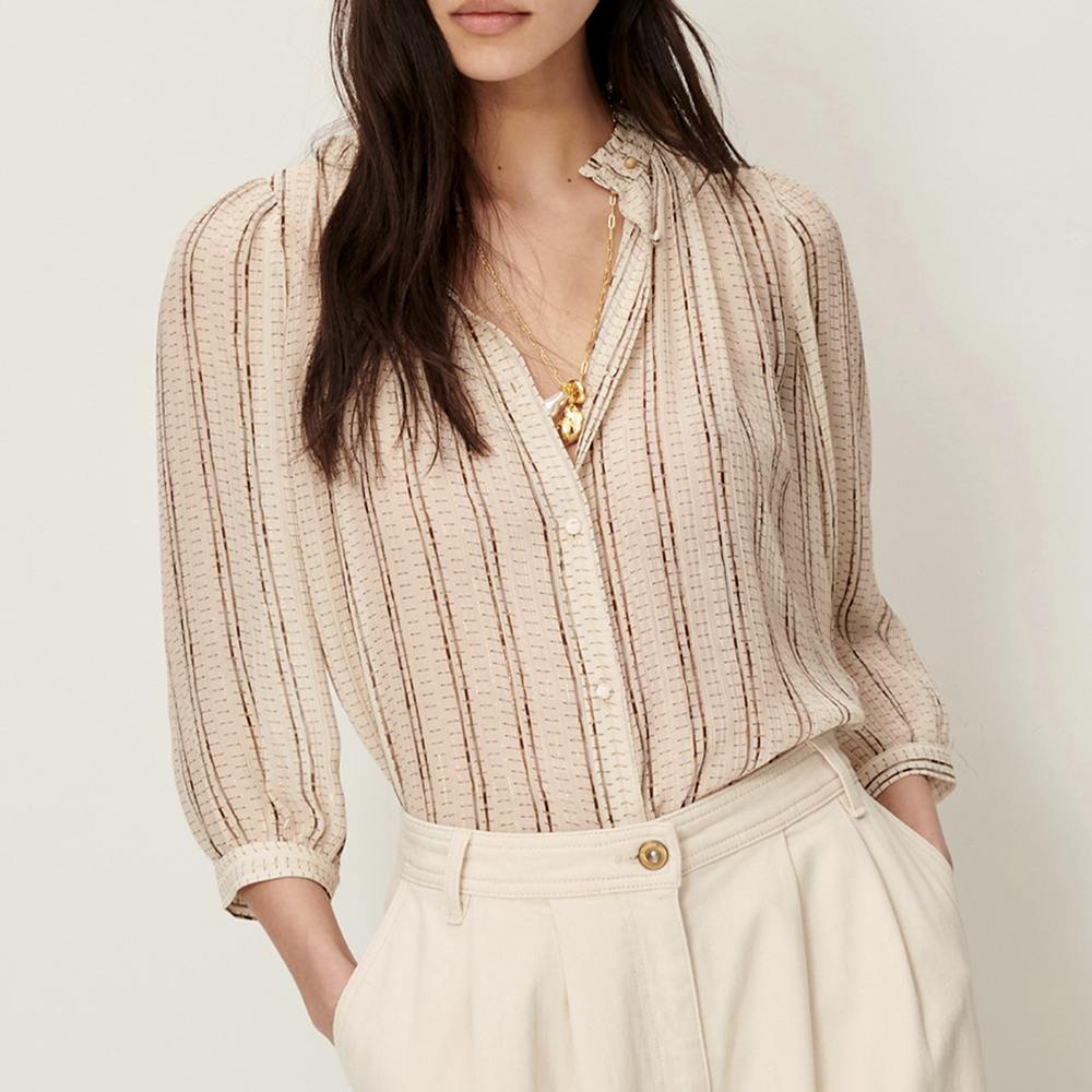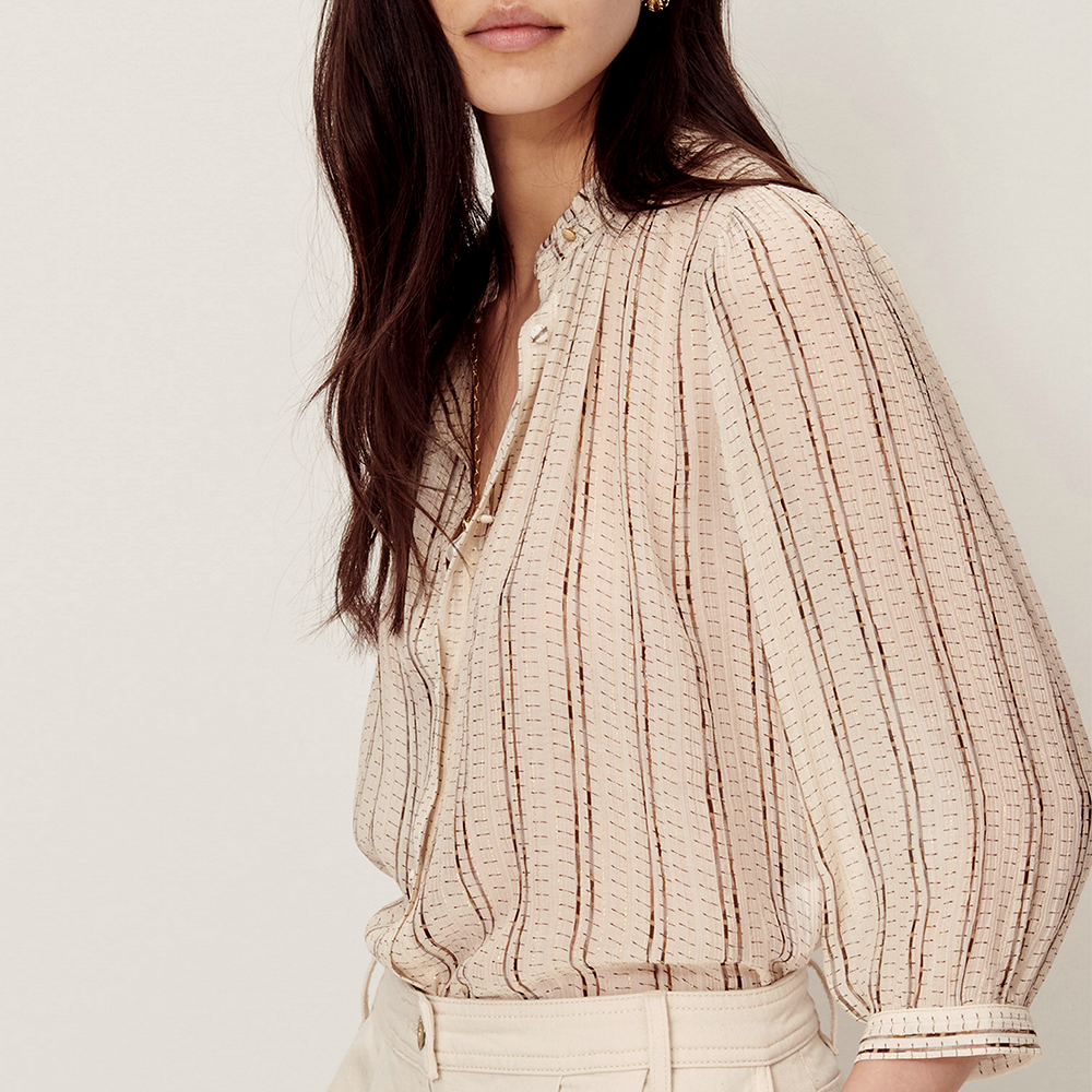 The Lylee blouse from Sessùn combines a luxurious blend of viscose and silk chiffon crepe with subtle metallic stripes for a refined, feminine elegance.