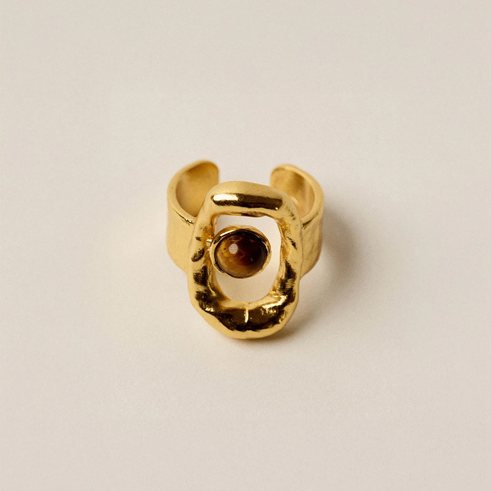 The sculpted Biuty Gold Ring from Sessùn features a textured gold finish adorned with a tiger eye cabochon.
