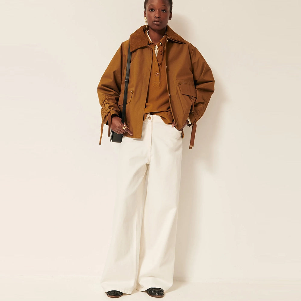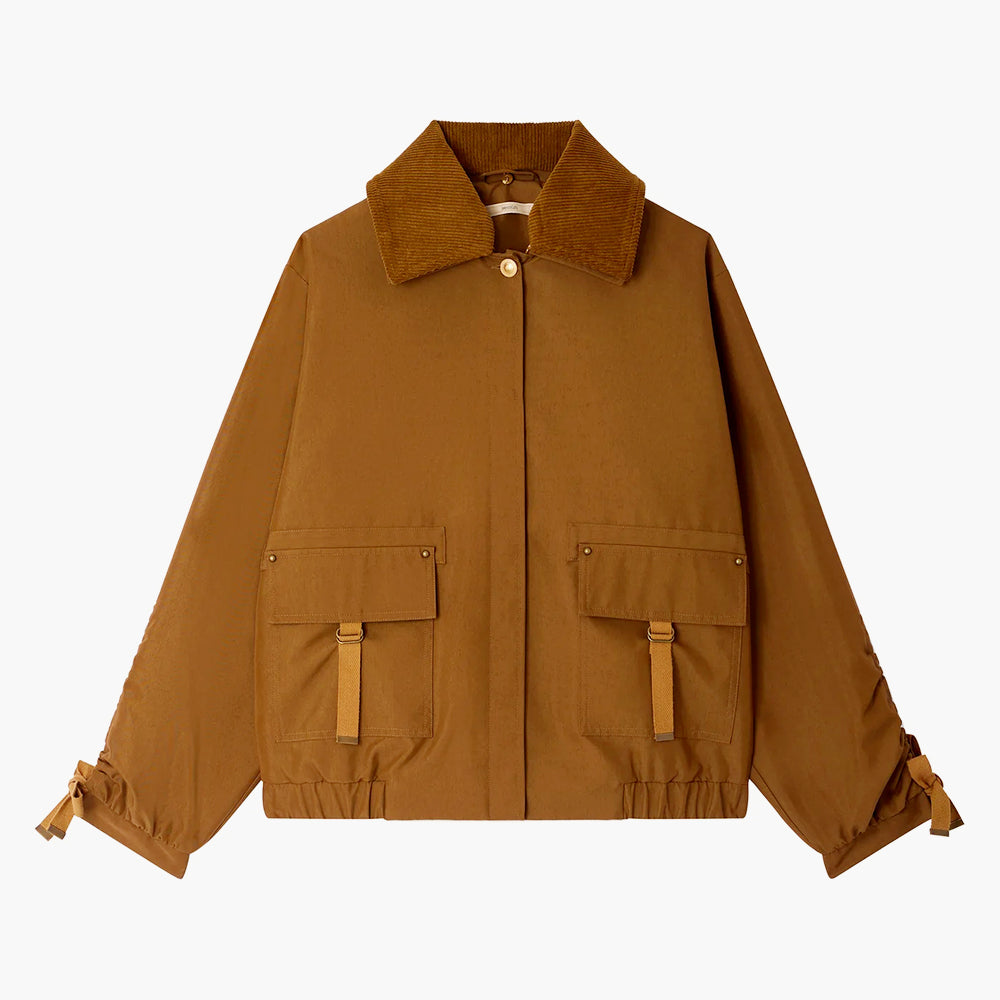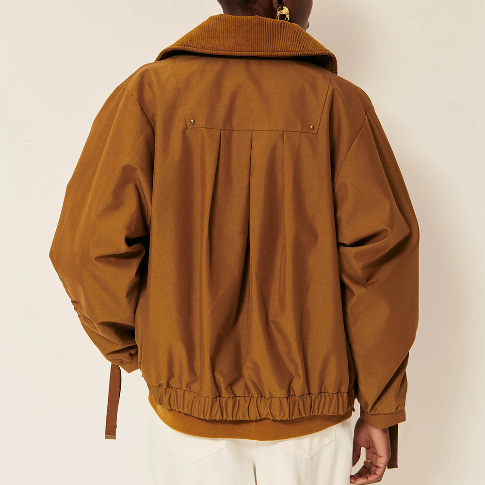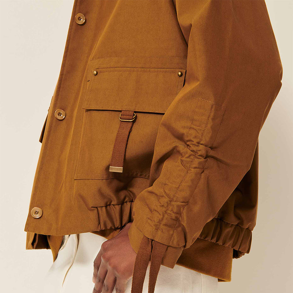 Designed with a slightly oversized blouson silhouette enhanced by an elasticated back, box pleats, patch pockets, and cinched sleeve tie details.