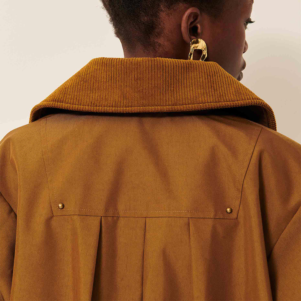 - Topstitched yoke on the back with rivet details and box pleats.