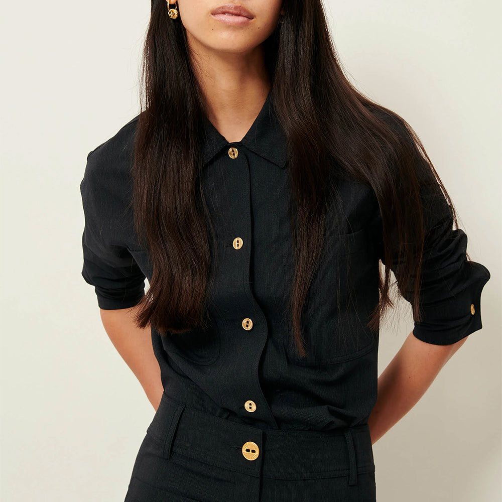 Functional patch pockets add practical elegance, while the structured fabric ensures a polished silhouette whether layered over a camisole or worn as a standalone shirt.
