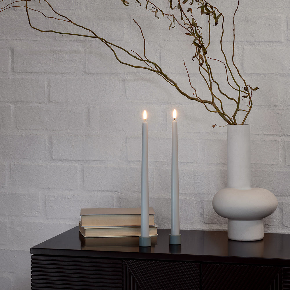 The Oyster Grey Slim Taper LED Candles by Uyuni bring timeless elegance and modern innovation to your home decor.