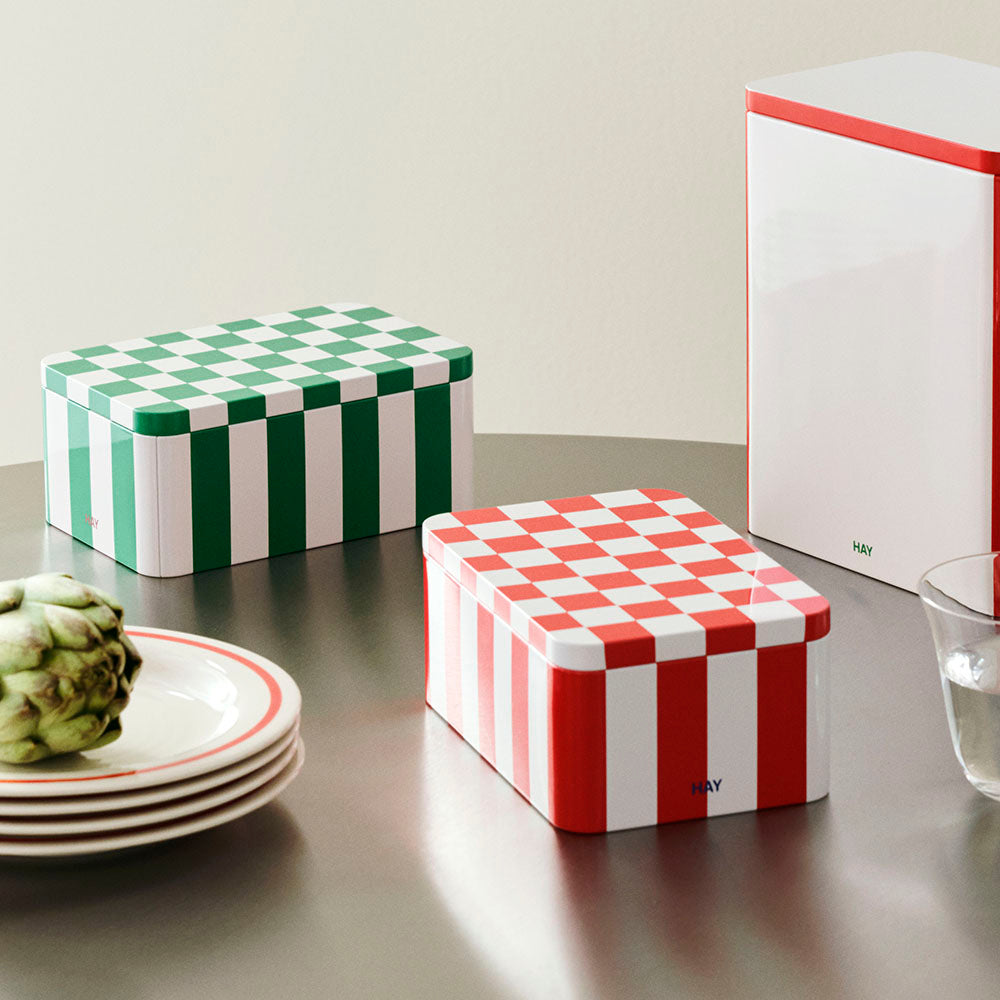 The stylish Tin Container from HAY is a functional and decorative storage box featuring a colourful checker pattern and a glossy finish.