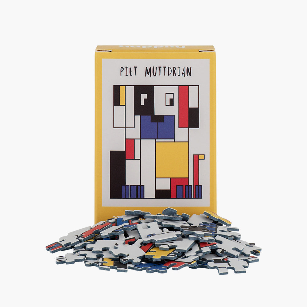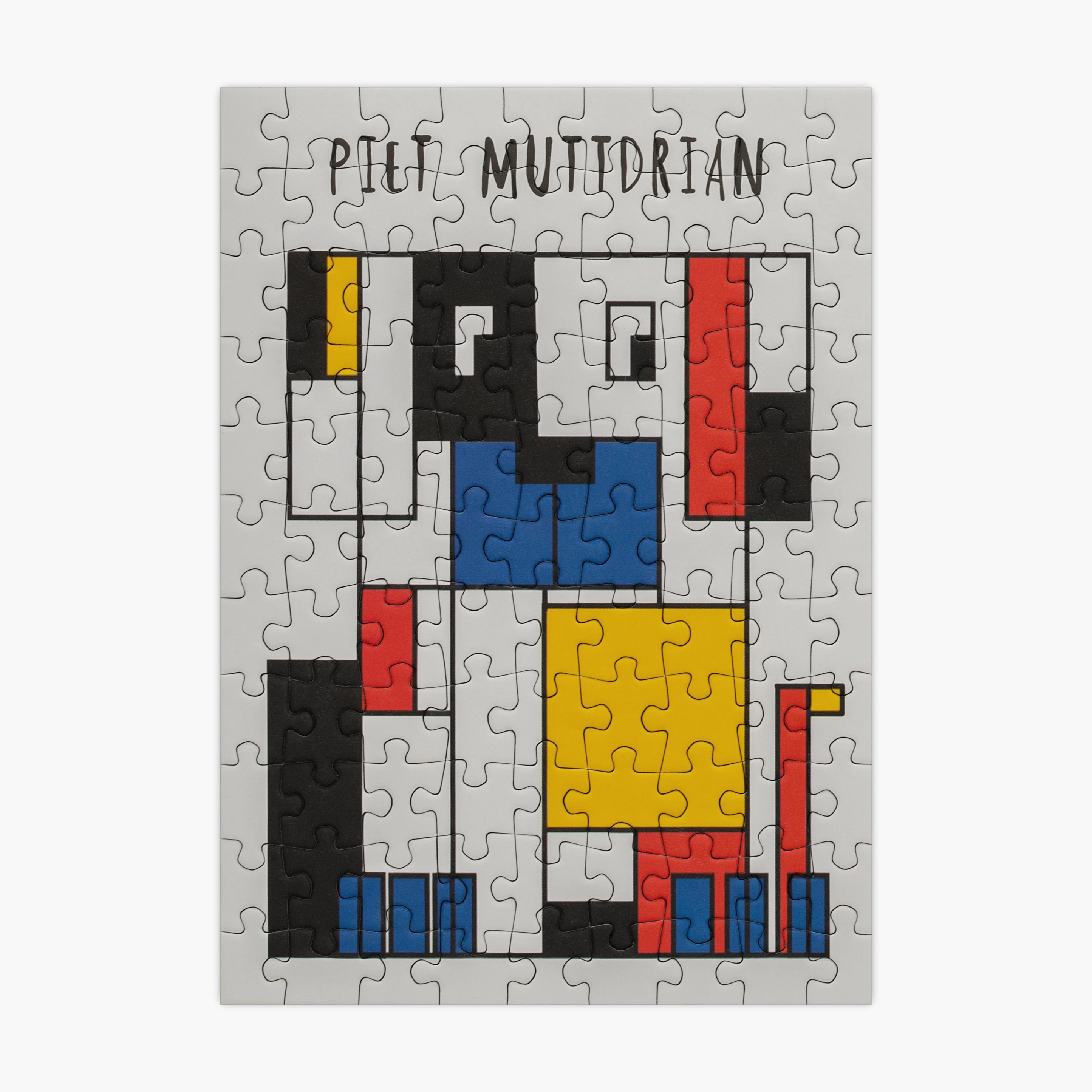 Inspired by Piet Mondrian's iconic geometric aesthetic, this 99 Piece Mini Jigsaw Puzzle reimagines a charming dog illustration through bold primary colors and clean lines.