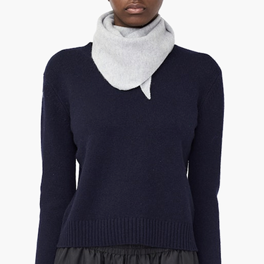 Its versatile triangular shape allows it to be styled as either a headscarf or a neck scarf, framing the face in a gentle drape.
