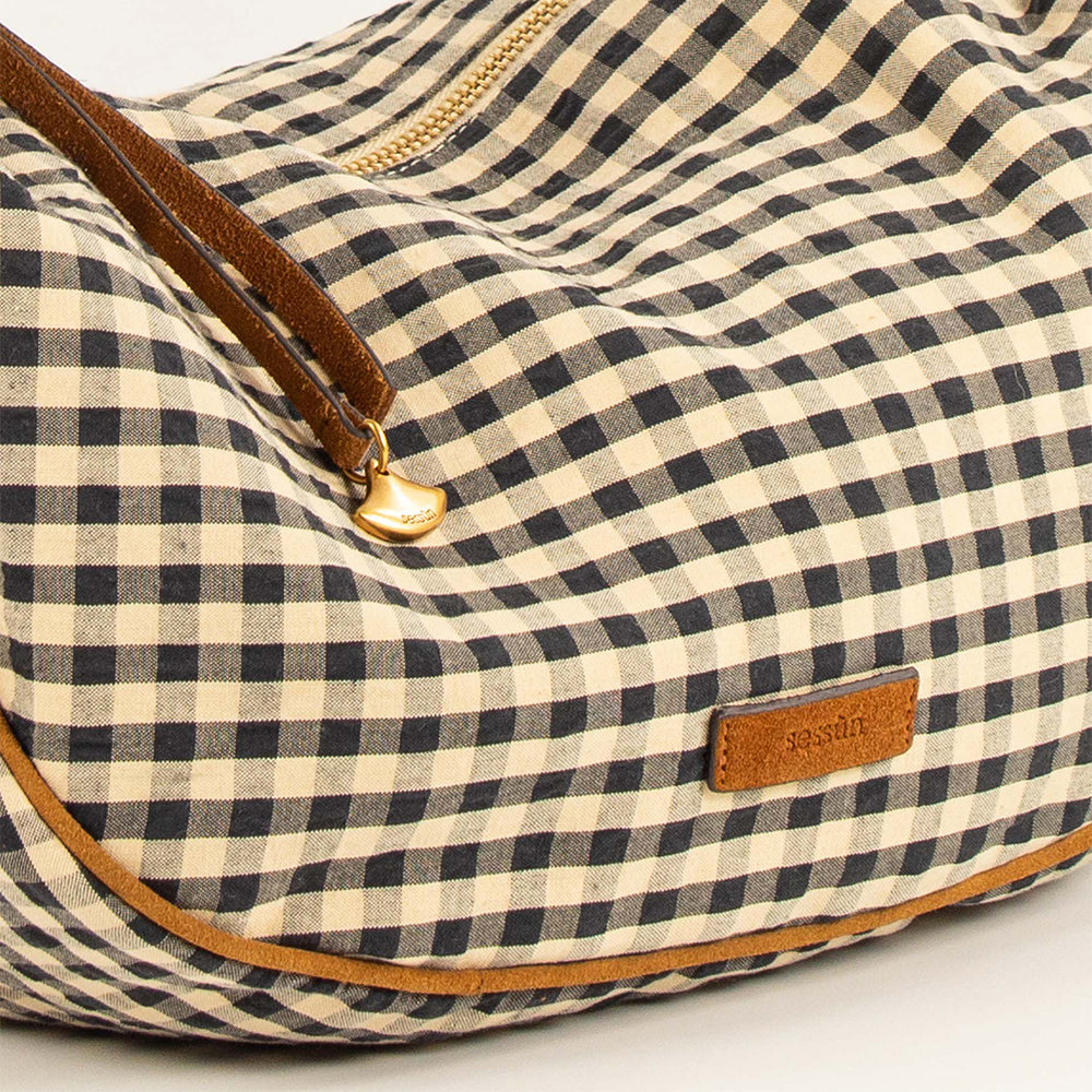 Crafted in soft, durable cotton fabric, featuring a classic black and white Madras check paired with suede leather details.