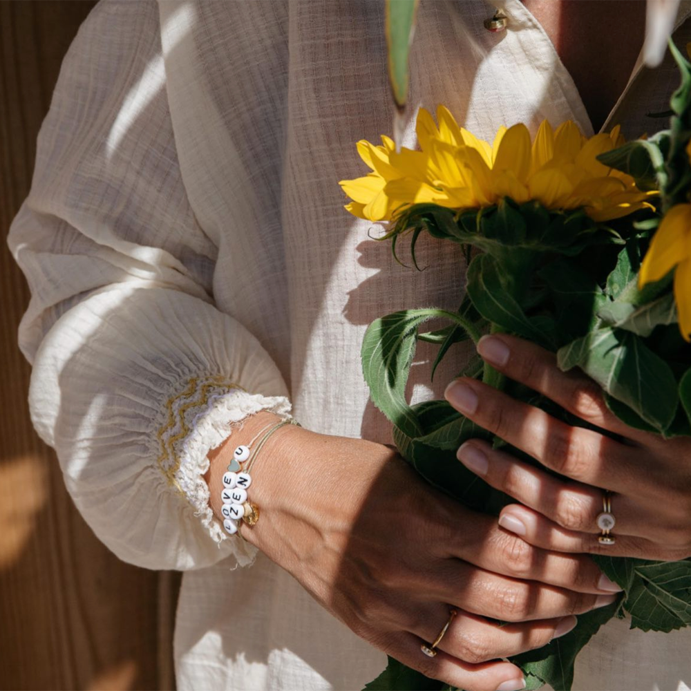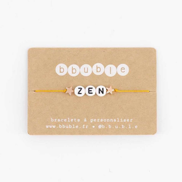 The ZEN Charm Bracelet from French label Bbuble is a chic and simplistic cord bracelet composed of white letter beads, two rose gold stars on a nude color cord.