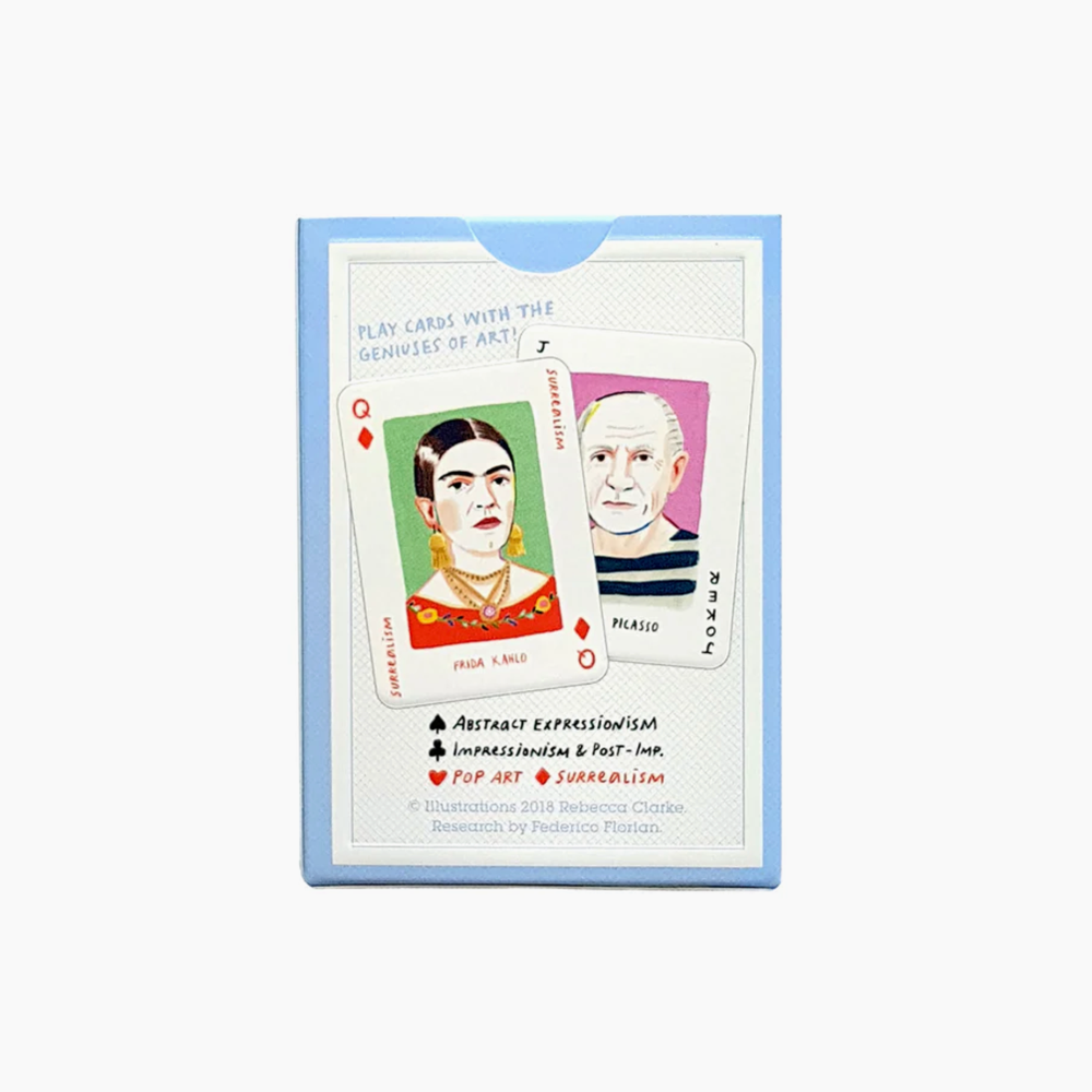 Includes 52 playing cards featuring illustrations of all the big names in the art world – including Lichtenstein and Hockney in Pop Art, Monet and Renoir in Impressionism, Pollock and Rothko in Abstract Expressionism, and Dalí and Kahlo in Surrealism – plus two jokers (Picasso and Matisse).