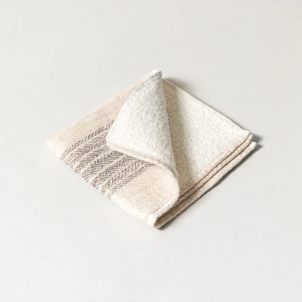 The soft and beautiful Flax Washcloth Face Towel from Kontex features a classic stripe detail against a beige chevron background, which gives the towel a slighty nostalgic look.