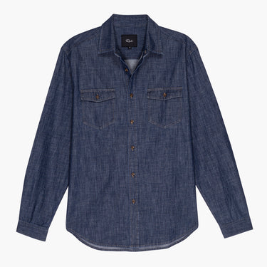 This long sleeve, collared buttondown shirt features double chest flap utility pockets and slim slightly relaxed fit.