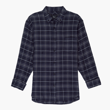 Long sleeve, button-down, heather blue and white plaid, relaxed fit shirt with single chest pocket.