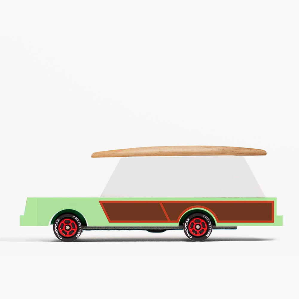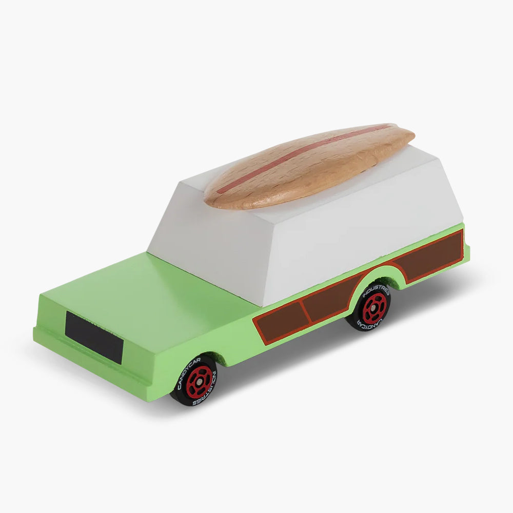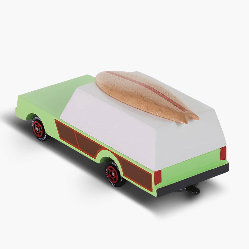 Swell times are guaranteed with the Surf Wagon. An attached wooden surf board and tow hitch for the CANDYCAR® Campers make for a radical combo.
