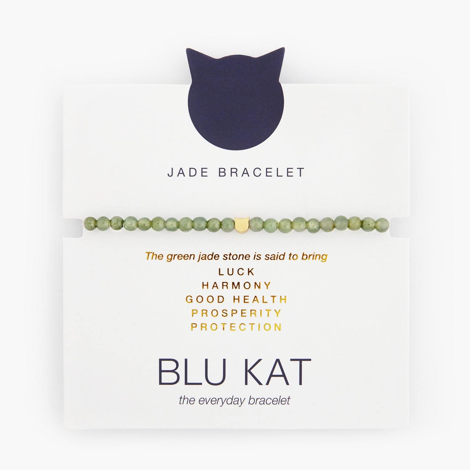 A delicate jade stone bracelet with our signature cat charm in gold colored brass.