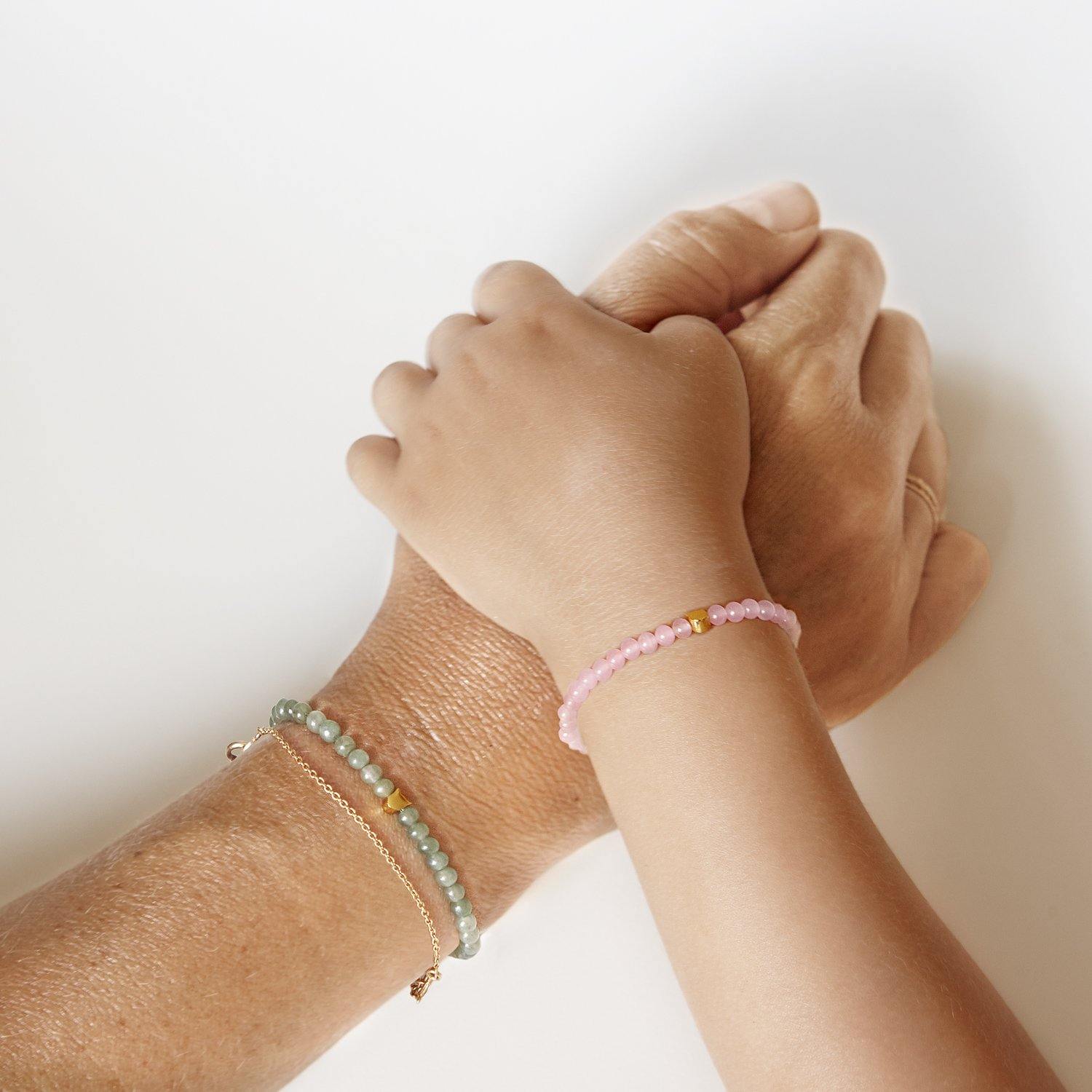 MATERIAL: Jade stones on a clear elastic string with one gold colored brass cat charm.