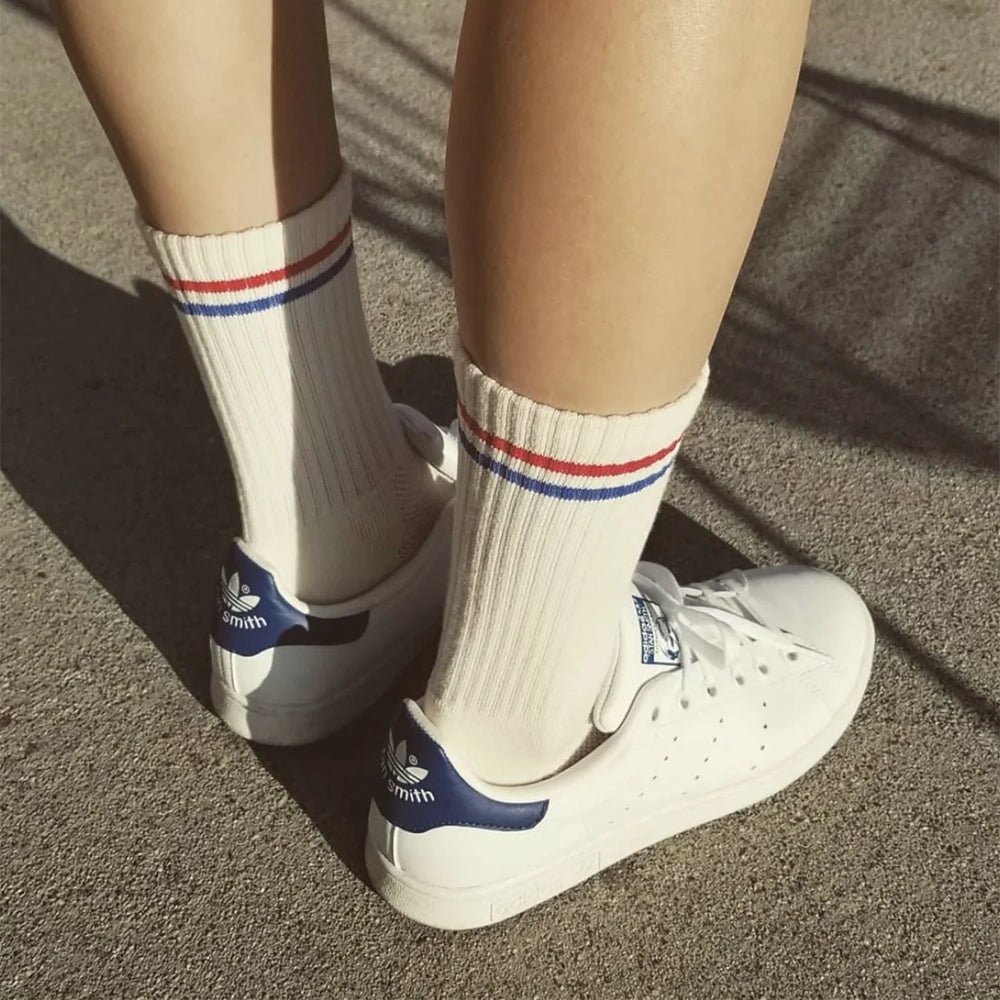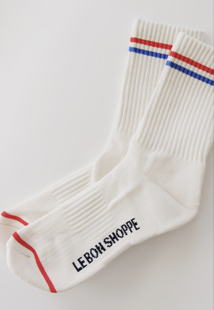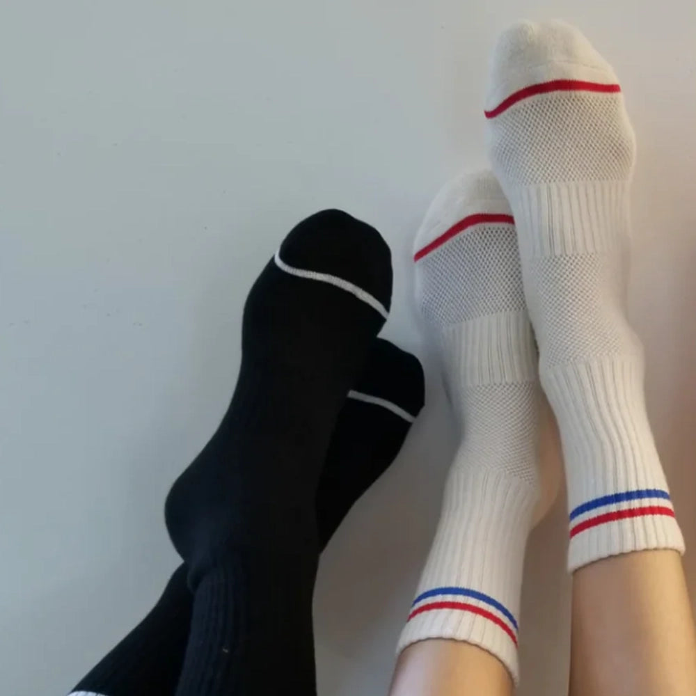 Meet your new sock obsession. The signature Boyfriend Sock from Le Bon Shoppe is the perfect mix of function and fashion creating an effortless sporty vintage charm to any outfit. The Boyfriend sock is slightly longer than a classic crew sock and has a contrast double stripe.