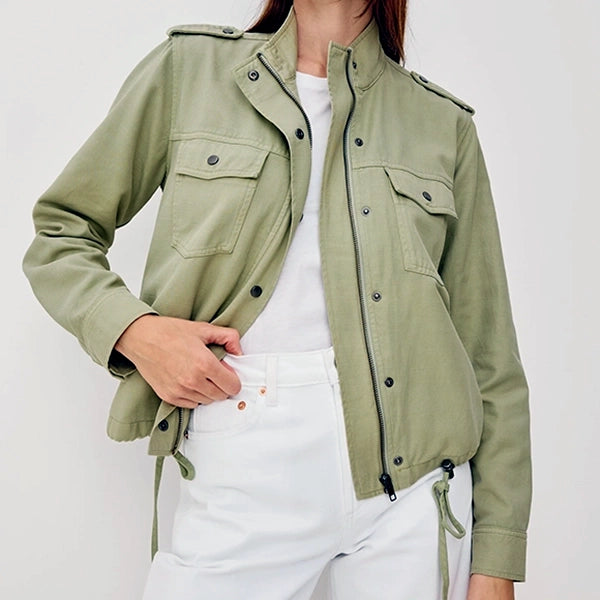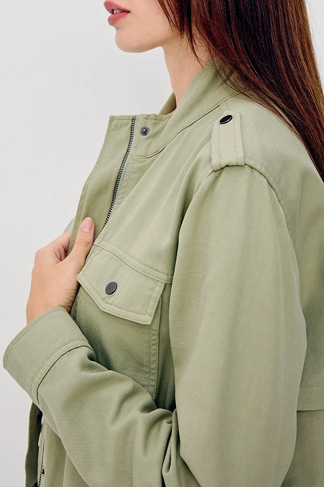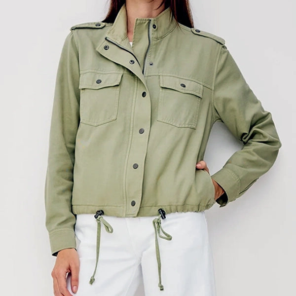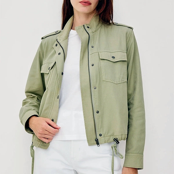 The Collins jacket features military-inspired details such as stand collar, shoulder epaulettes, flap chest pockets, front snap buttons, and a cropped drawstring hem.