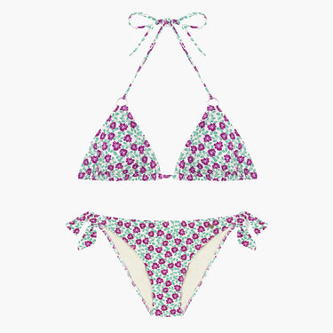 This classic white triangle bikini features a beatutiful floral print in Bougainvillea purple and green. Crafted with high quality, recycled materials.