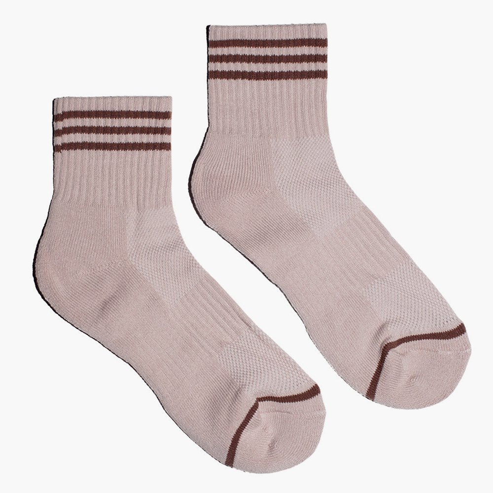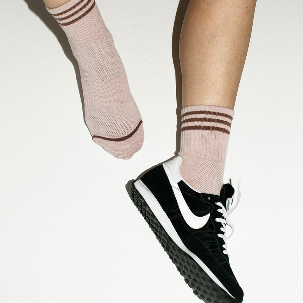 The Girlfriend Sock features a contrast triple stripe, mesh along the top of the foot for breathability, and elastic arch support.